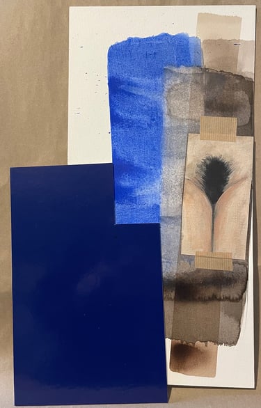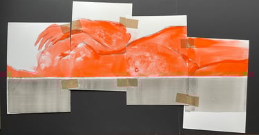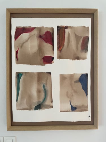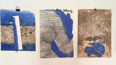Ces peintures sur papier (au brou de noix, à l'acrylique, comportant parfois des collages) sont notamment des variations sur certains croquis préparatoires de J.-A.-D. Ingres .