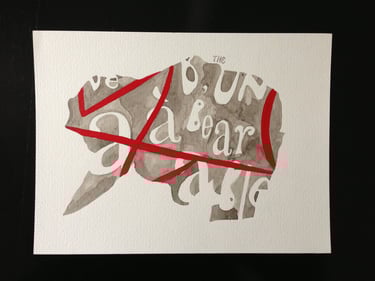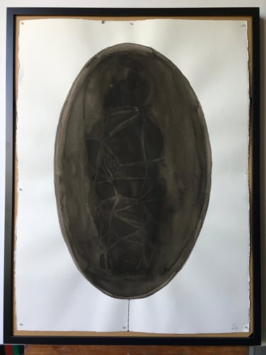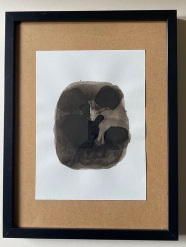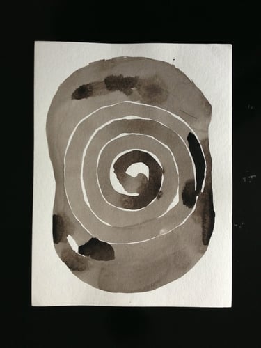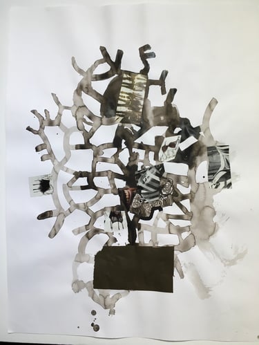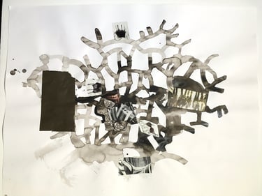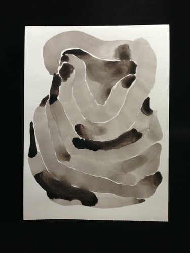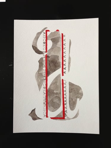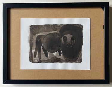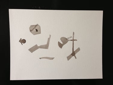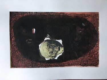 Gouache sepia naturelle ; quelques rehauts de rouge ; quelques collages.